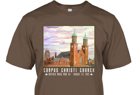 The artwork for the shirt is a painting by Lisa Wiertel. Her grandmother, Jane Wiertel, was baptized at Corpus Christi in 1914. It is absolutely wonderful. (You can see more of Lisa’s artwork by clicking here—>)
