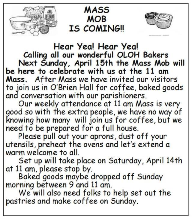 - After Mass, the parish will be hosting a small coffee and baked reception in the church hall right next to the church. There will also be a 50/50 drawing at the reception.