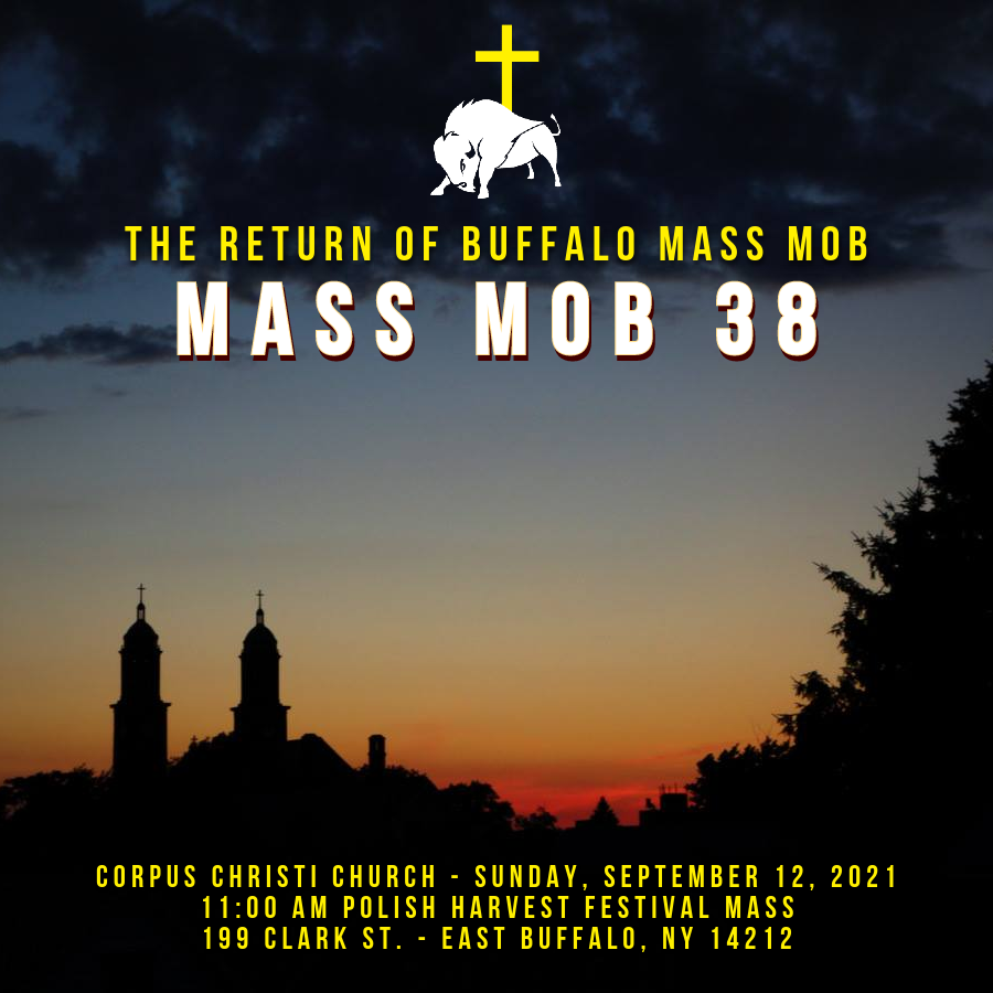 Get ready, Buffalo. Buffalo Mass Mob is back. Our last Mass Mob was in March of 2020 right before the COVID-19 shut everything down. We are pleased to announce that our 38th Mass Mob will be at Corpus Christi Church in East Buffalo’s Broadway-Fillmore neighborhood on Sunday, September 12 for the church’s annual Polish Harvest Festival Mass. The Mass starts at 11:00 AM.